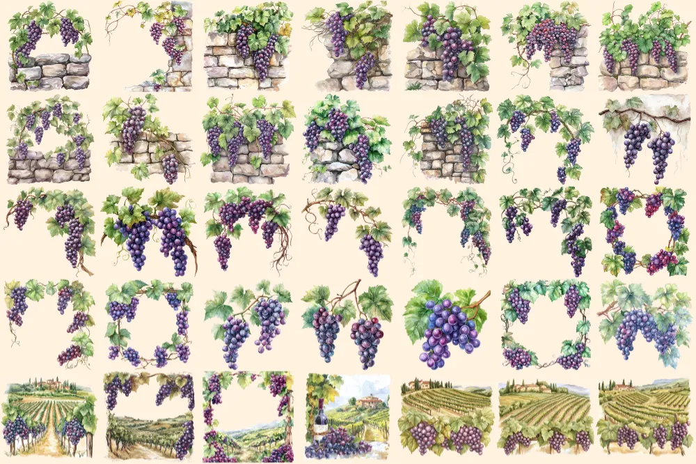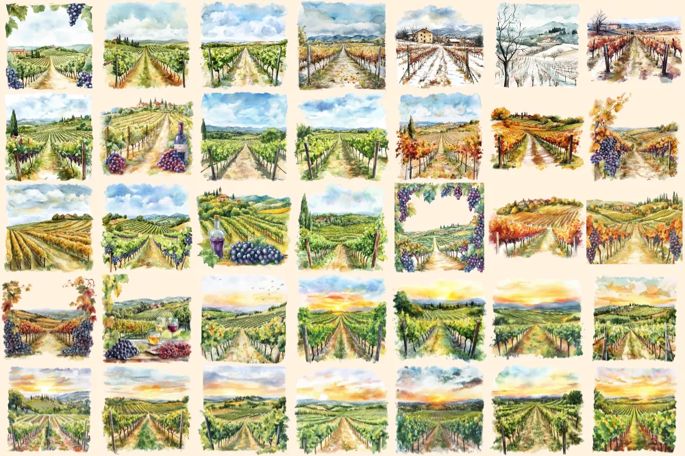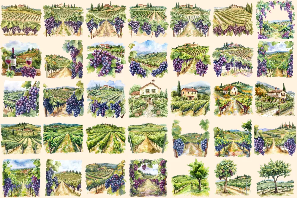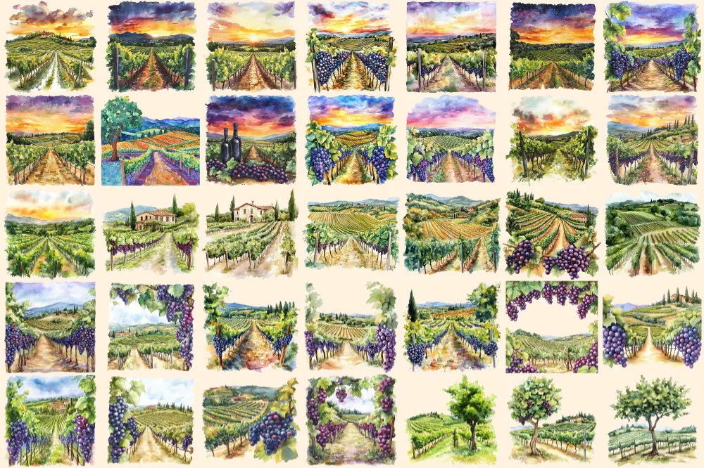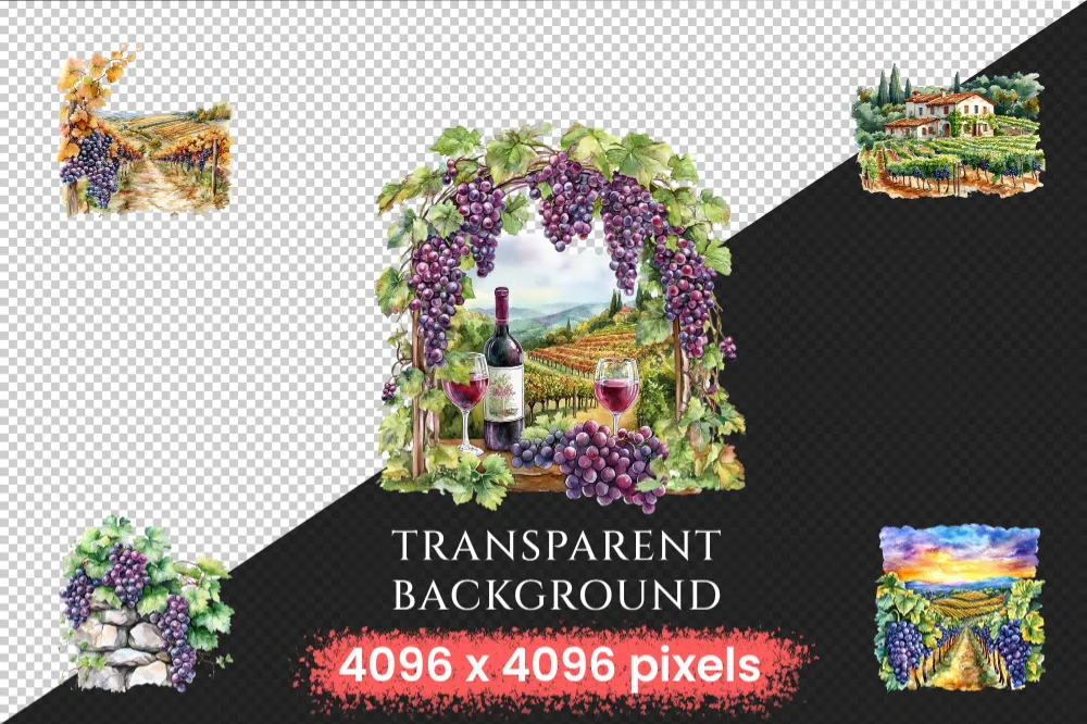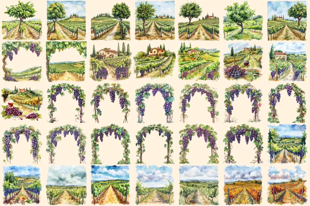 Vineyards Watercolor Clipart Bundle – 233+ transparent PNG, Rustic vineyard landscapes, Wine decor images, Commercial use, Digital download
