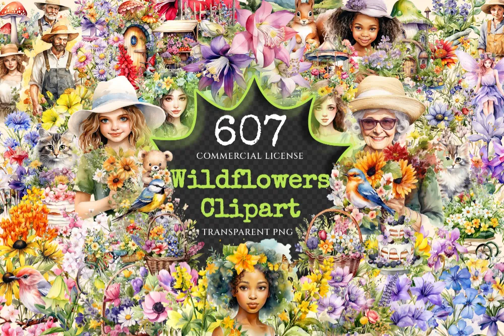 Wildflowers Watercolor Clipart Bundle – 604+ transparent PNG, Blooming wildflower graphics, Spring nature, Commercial use, Digital download