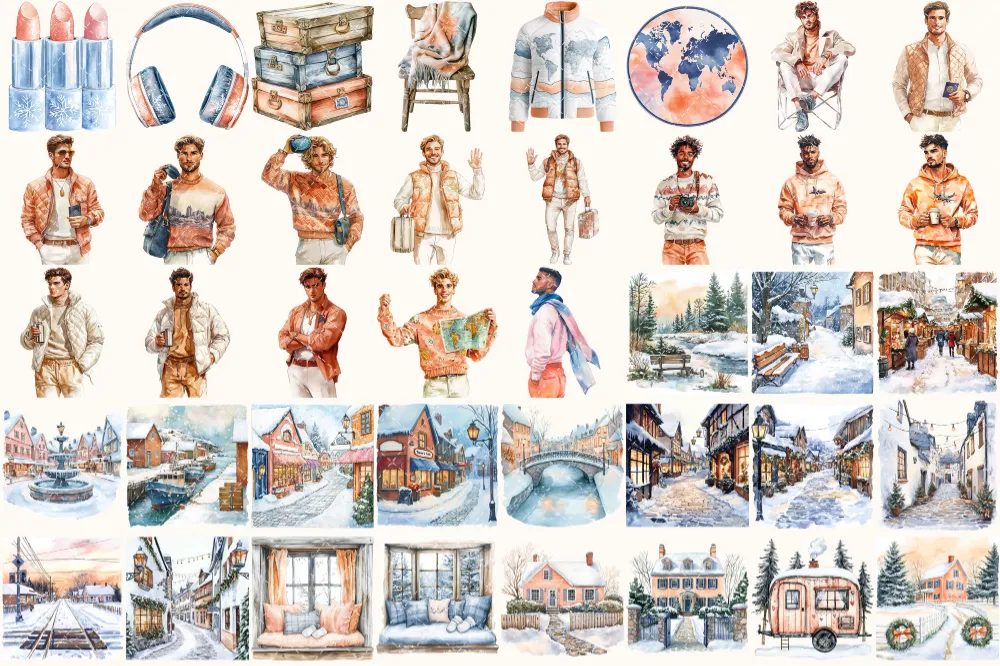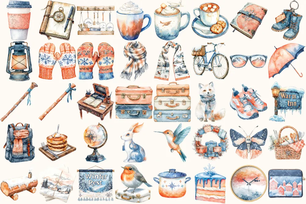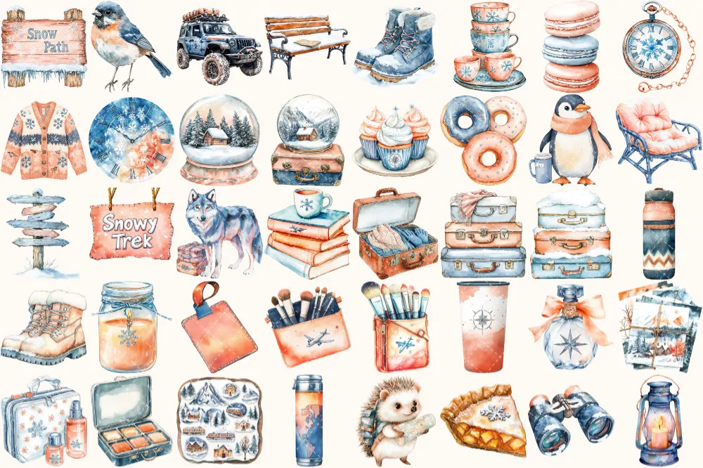 Winter Expedition Watercolor Clipart Set – 260+ transparent PNG, Winter travel illustrations, Adventure png, Commercial use,Digital download