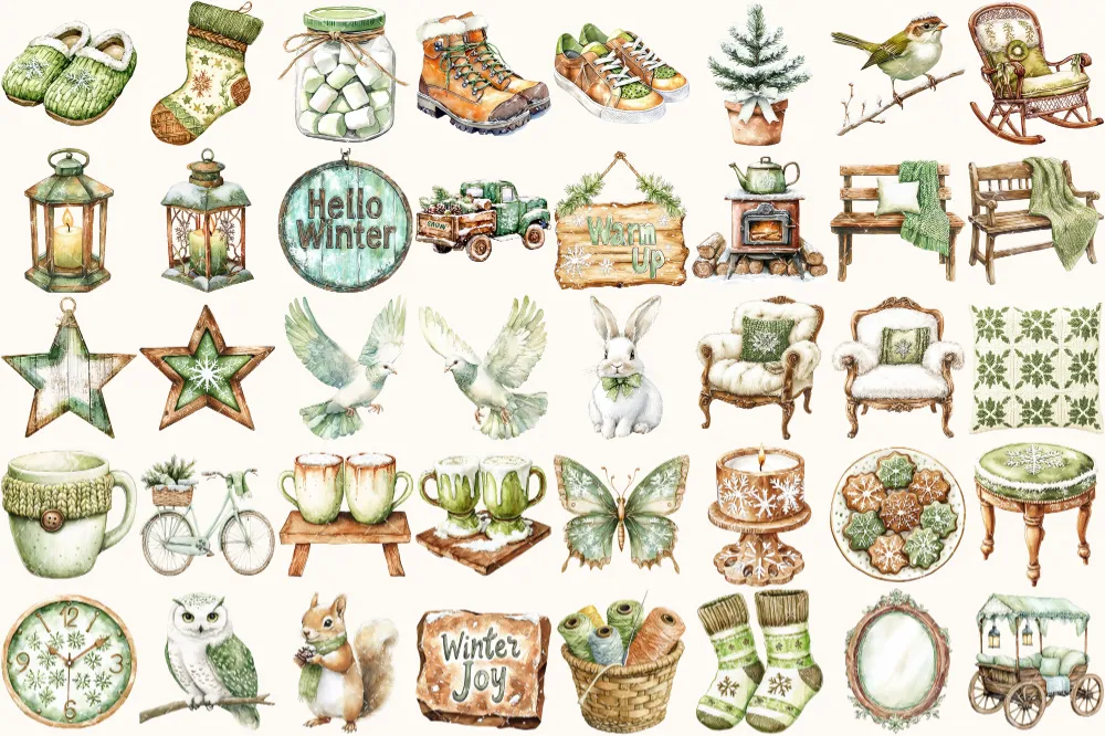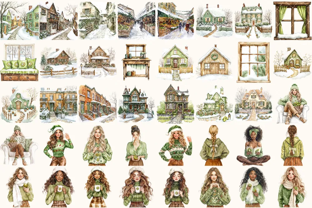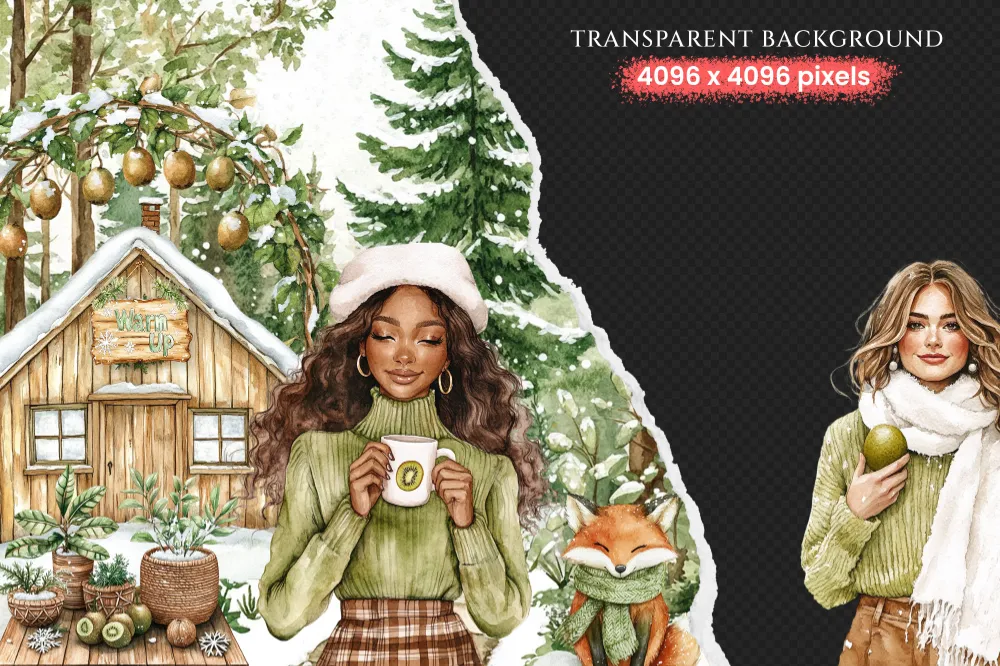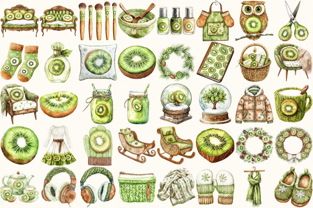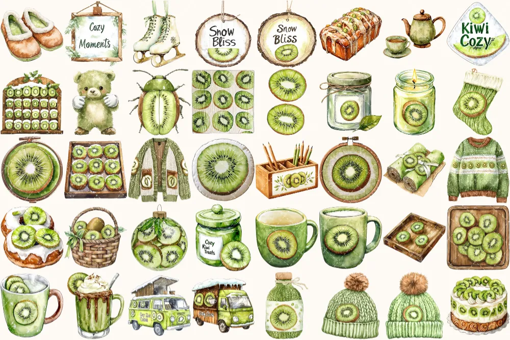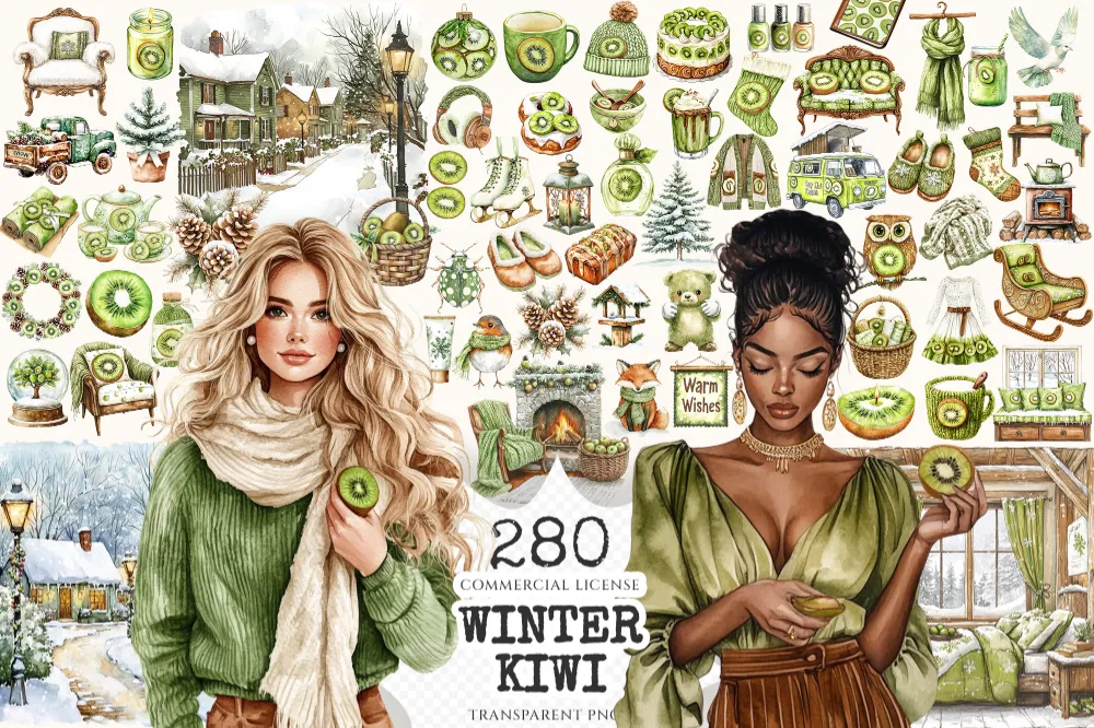 Winter Kiwi Watercolor Clipart Set – 275+ transparent PNG, Winter fruit illustrations, Cozy winter art, Commercial use, Digital download