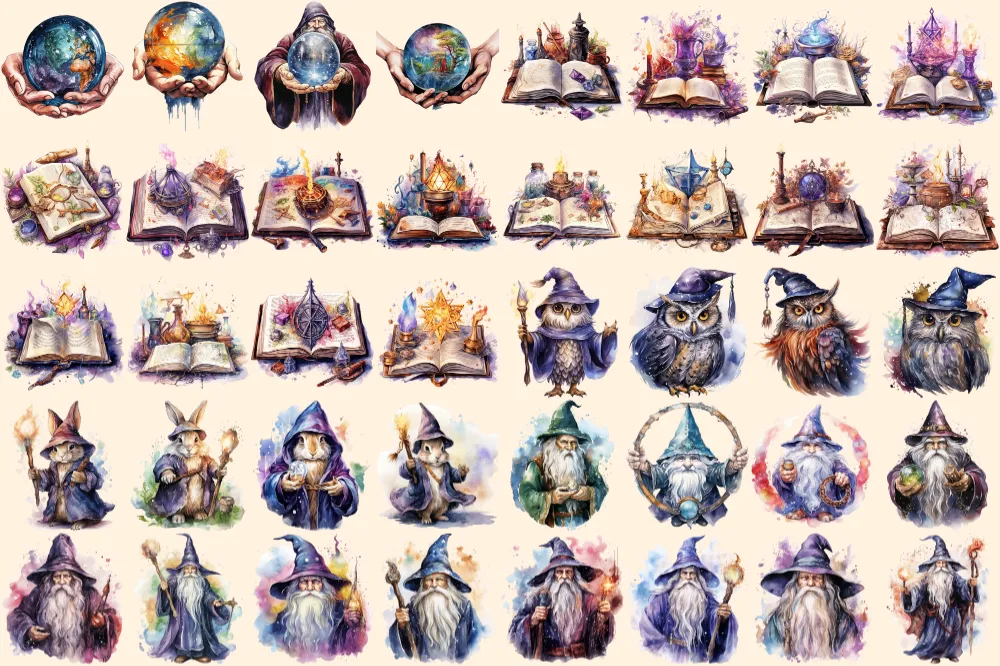 Wizards Watercolor Clipart Bundle – 250+ transparent PNG, Enchanted graphics, Fantasy storybook images, Commercial use, Digital download